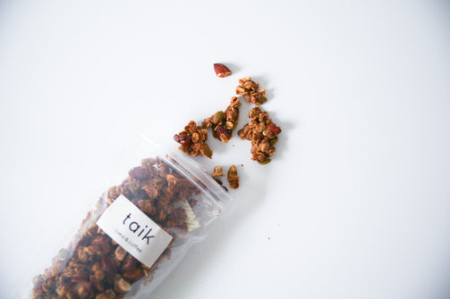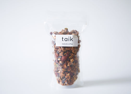 オートミールやカボチャの種、アーモンド、デーツ、イチジクなどの素材を使用してじっくり低温で火を通して仕上げた自家製のグラノーラ。少しスパイスの効いたグラノーラになるのでそのままでももちろん美味しくお召しがりいただけますが、ヨーグルトやアイスクリームに添えて一緒に食べるとより美味しくお召しがりいただけるのでおすすめです。